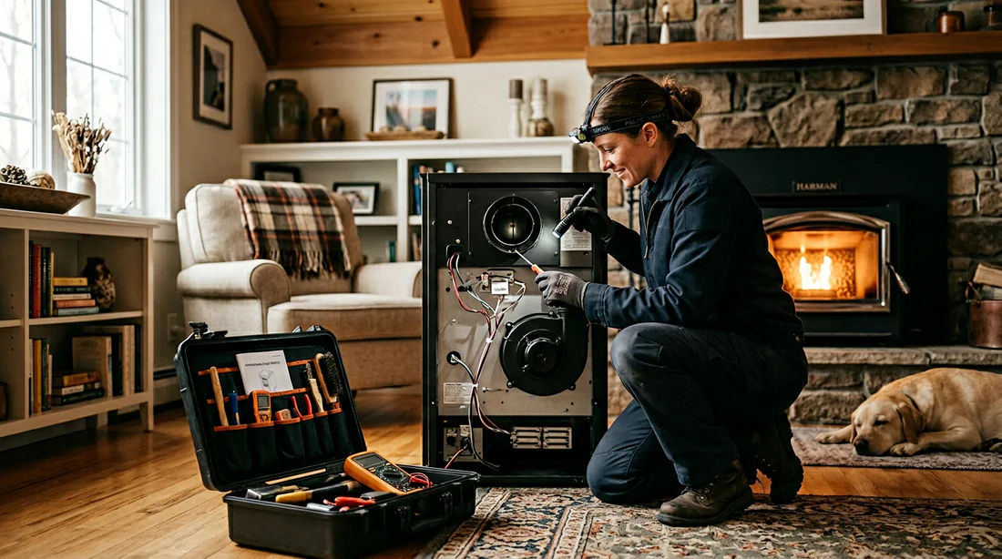 Technicien vérifiant la sécurité d'un poêle à granulés Moretti.
